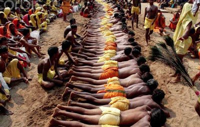 The Danda Nata is the most ancient folk dance in which devotees do penance by piercing their skin or tongues with iron nails, standing on sharp-edged swords, and walking on red hot charcoal. The Sambalpuri folk dance originated from the vibrant Sambalpur district in which the performers sing Dalkhai to the beats of timkis, drums and nisans. Chaitighoda is a folk dance of fishermen in which a dancer inside a horse costume gallops like a horse and is accompanied by two other characters the Rautani and the Rauta. Medha Nacha is a folk dance in which a performer puts a paper machie mask and dances to the beats of music in a procession. There are some tribal dance such as Karma and Changu that are performed by Gonds, Binjahal, Kharia, Oraon, Kisan, Kol and Juang tribes.